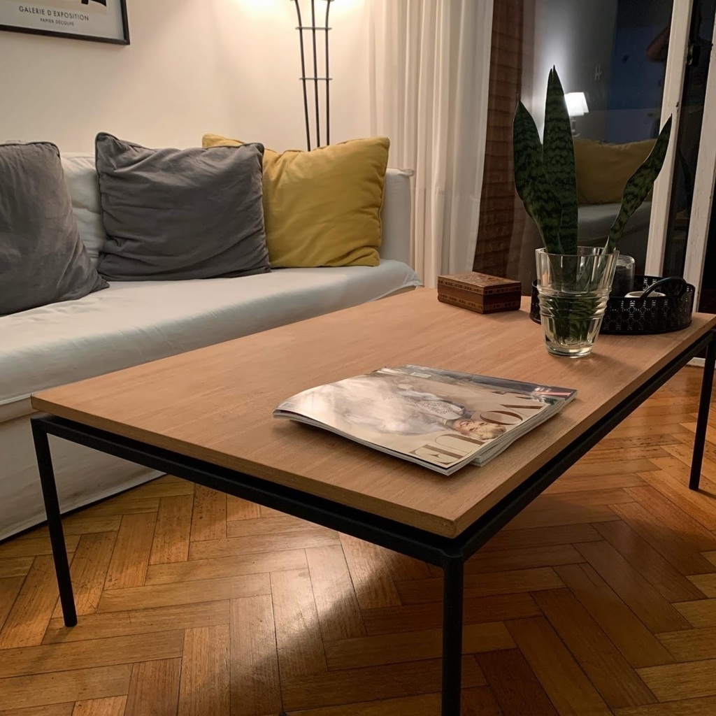 Mesa ratona con estructura de hierro y tapa de madera enchapada. Su detalle distintivo es la separación entre la tapa y la estructura, que la hace delicada y minimalista.